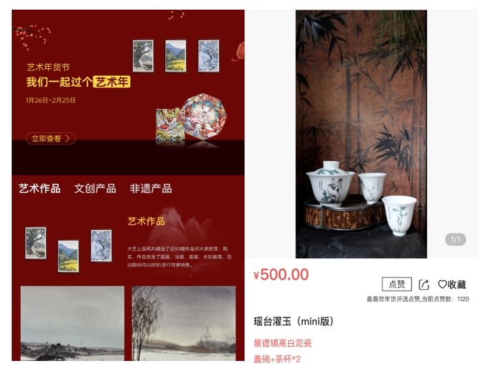 为了让更多市民关注文化、喜欢艺术,“重庆艺术大市场·艺术年货节”主办方通过大艺上品网开展“我最喜欢的艺术年货”点赞评选活动。参与评选的艺术年货包括重庆非遗及乡土艺术特色产品、重庆本土艺术家架上艺术品,以及大量重庆特色文创品等。截至2月25日,共收到网友点赞投票129796票,排名前五的产品当选本次艺术年货节“我最喜欢的艺术年货”,分别是著名画家晏济元的版权衍生品《瑶台濯玉MINI》、荣昌陶小茶罐、四川美院环保龙纹帆布袋,以及原创绘画作品《奉节写生》和《定格的光阴》。